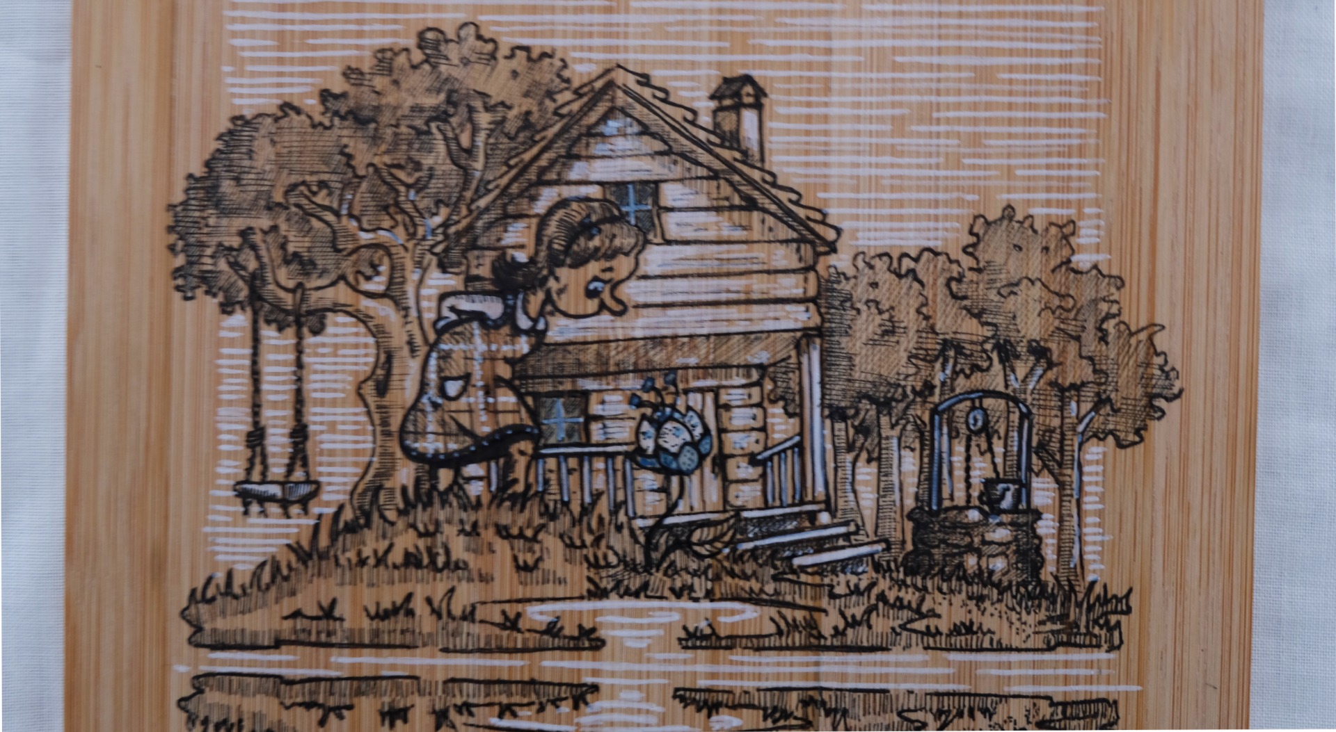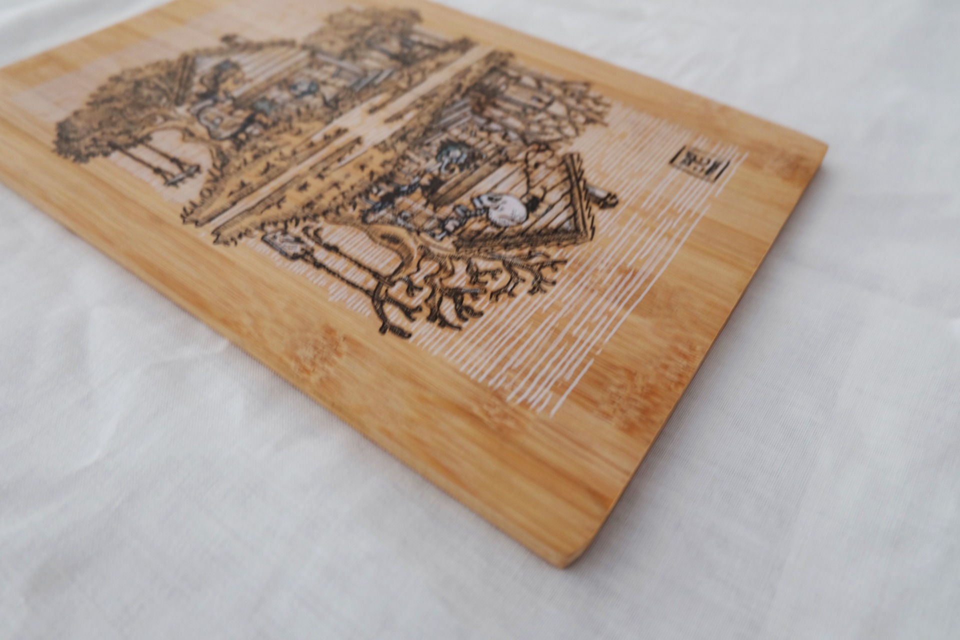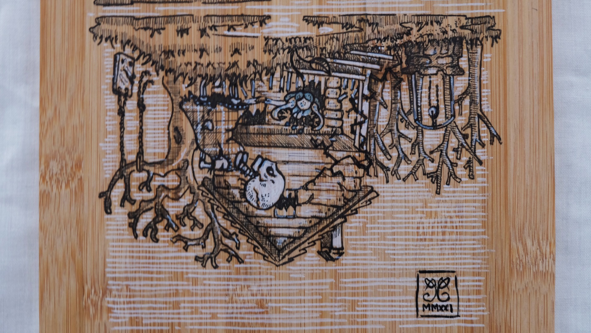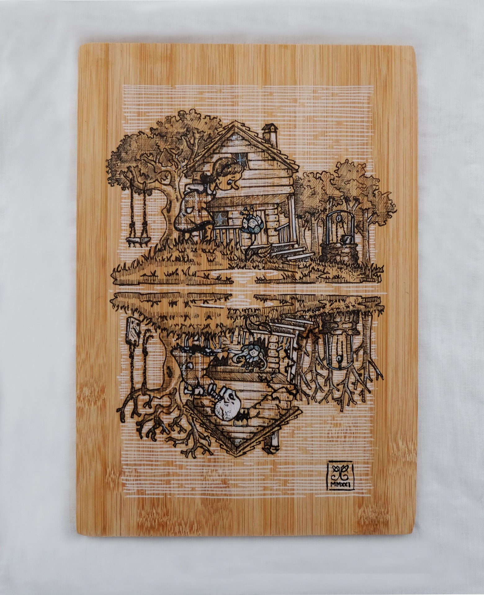 TÉCNICA: Ilustración realizada con tintas blanca y negra, con toque de color azul. Soporte de tabla de bambú.